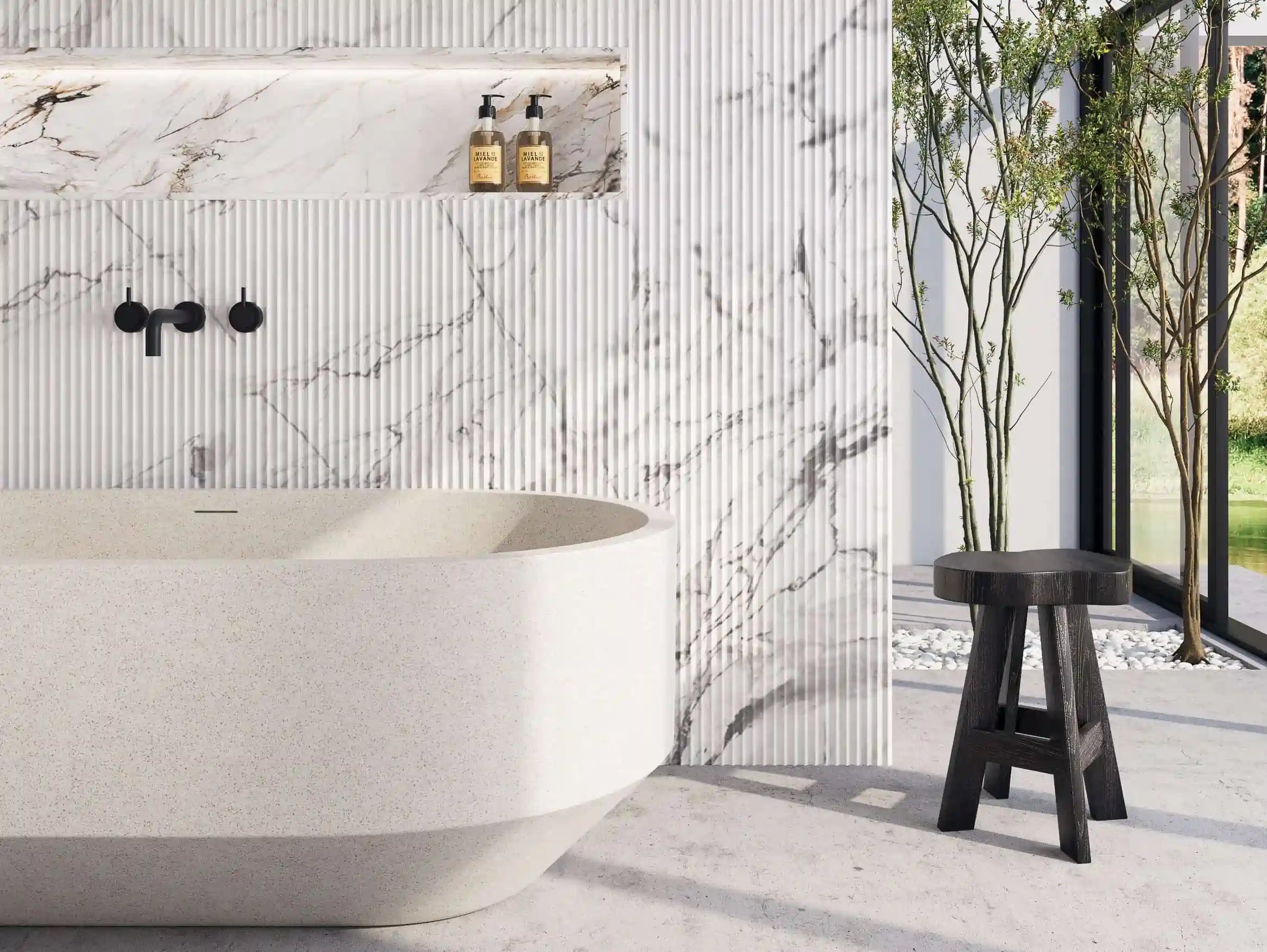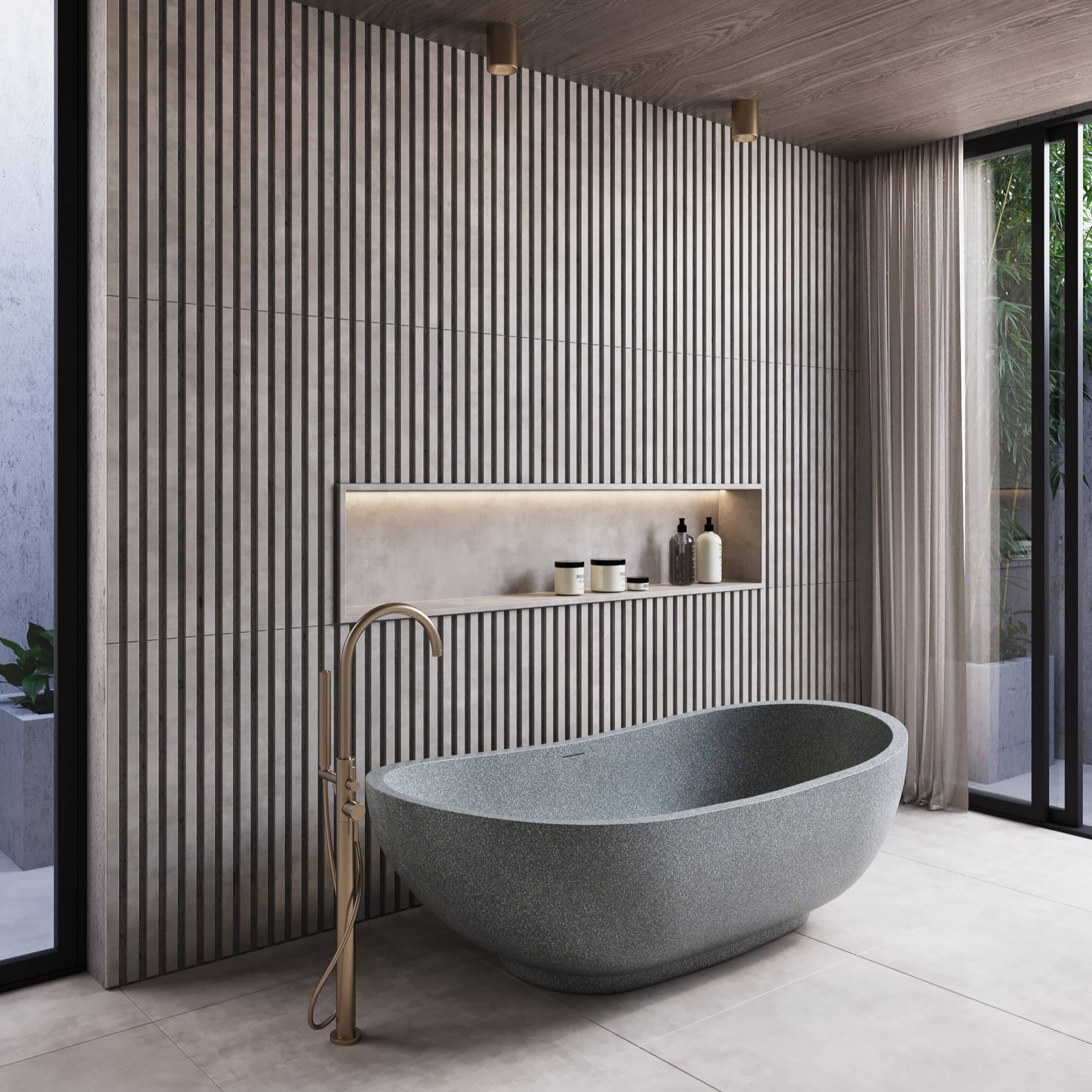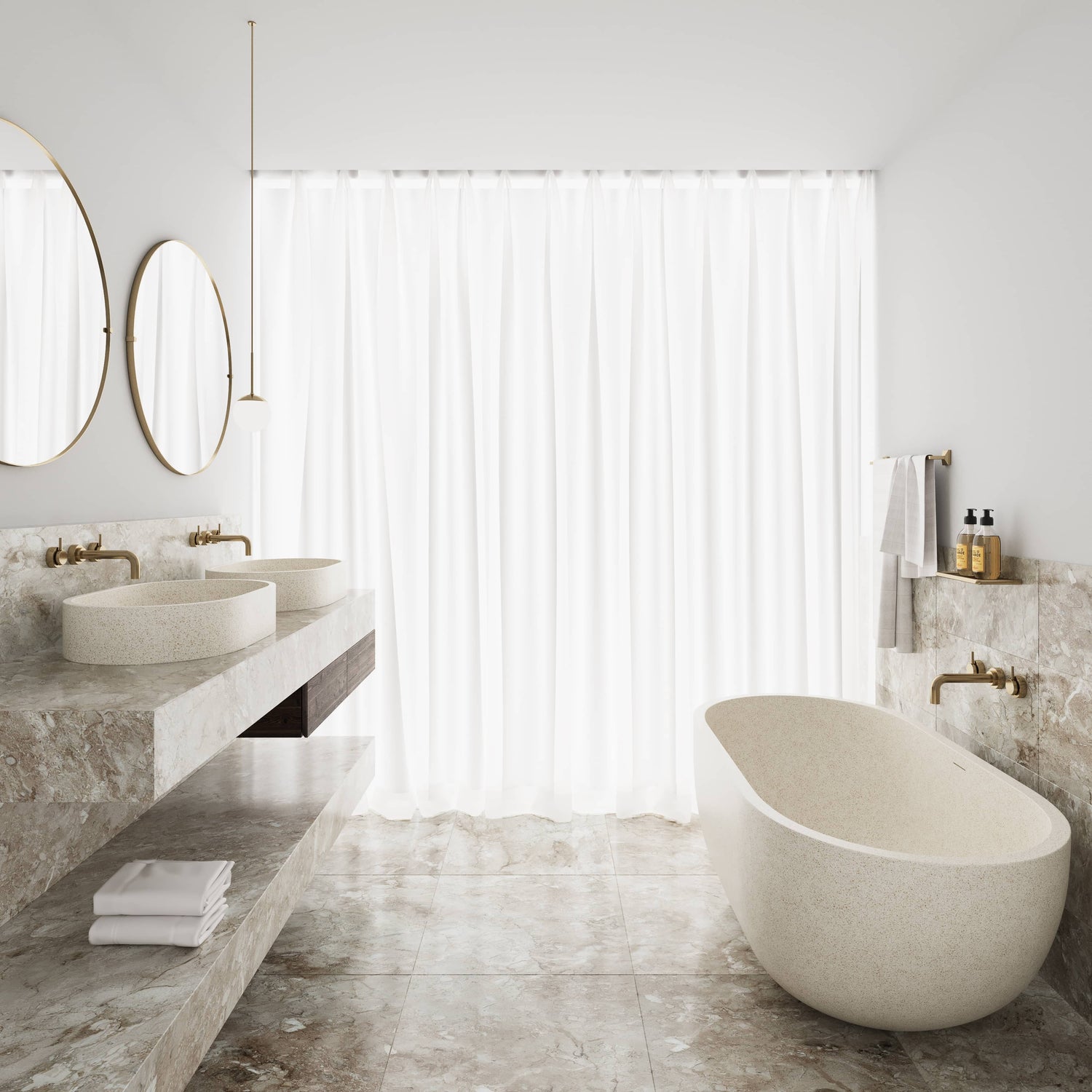 MoreIntroducing a freestanding bathtub with serene design and sculptural allure. Crafted from composite stone for durability and easy maintenance.